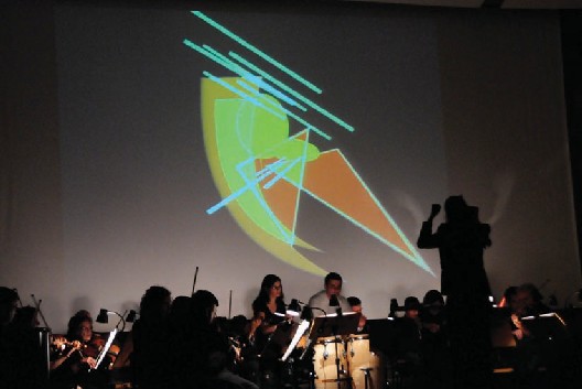 Figura n.5: Orquestra Sinfônica da Unicamp executando a obra “Curto Circuito II” (2010) durante o concerto SimetriaS, Auditório da FCM, Unicamp. A projeção ao fundo destaca os objetos gráficos que interagiam com as sonoridades da orquestra.