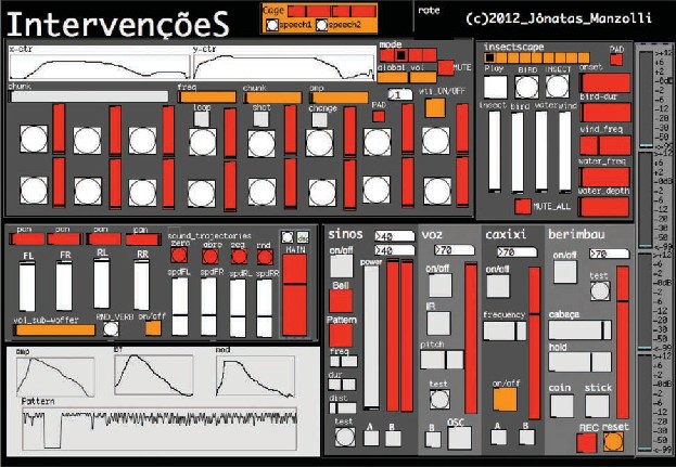 Figura n.6: Interface gráfica do programa Intervenções desenvolvido em Pure Data. Vê-se que o sistema computacional criado para obra tem quatro módulos diferentes. No sentido horário, à esquerda abaixo, o módulo de espacialização sonora