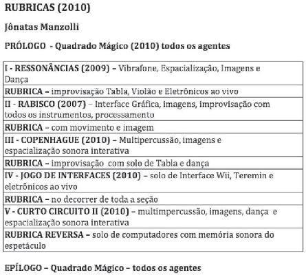 A performance de RUBRICAS foi realizada a partir da noção de discurso textu- ral entendido como a costura de elementos sonoros, visuais, movimento e ação cênica. Foi desenvolvido um jogo de materiais que se encadearam e se encaixaram em novas estru- turas, mais complexas, a partir de materiais elementares. Os materiais de partida, cinco excertos criados por Manzolli, foram estruturados em pares (vide Figura 8), cada excerto foi seguido por uma rubrica que levou os agentes à improvisação. Os pares fomentaram diferenciações na qual som, imagem e movimento desenvolveram-se como desfigurações do eixo inicial.
