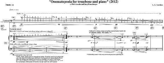 Na obra de L. E. Castelões “Onomatopéias for Trombone and Piano”, podemos ob- servar uma série de elementos (escritos) que vão deixar explícita a intenção daquilo que o compositor quer representar, isto é, que qualidade de sonoridade procura e quais os meios para consegui-la: