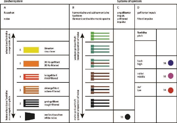 Essa proposta interessa a este trabalho já que ela apresenta um caminho contrário ao do exemplo anterior. Um caminho oposto no processo de tradução. Na partitura aural de Rainer Wehinger sobre a obra Artikulation (1958), de Ligeti, o autor cria uma tradução grá- fica dos eventos sonoros baseando-se nas anotações do compositor, procedendo a estabele- cer uma esquema de tradução a partir de quatro categorias principais: A: Ruído, B: Espectro Harmônico e Sub-harmônico, C: Impulso sem filtrar, D: Impulsos Filtrados. Cada uma des- sas categorias (junto às nuanças internas de cada uma), tenta dar conta da representação do universo sonoro, transmutado em signos escritos.