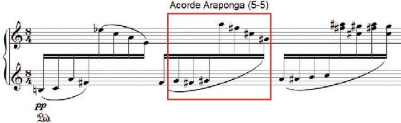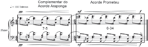 Contudo, por analogia ao tratamento dado por Scriabin ao hexacorde 6-34 (Acorde Prometeu), podemos compreender o Acorde Araponga como uma sonoridade, que se com- plementa com o heptacorde 7-5 e pode ser transposta ou invertida, sem prejuízo do seu conteúdo intervalar. Não obstante, é preciso contextualizar cada posição deste conjunto de forma a não dissocia-lo da proposta inicial ao ponto da total descaracterização de registro,![]()