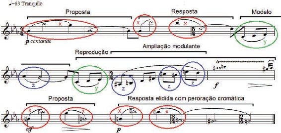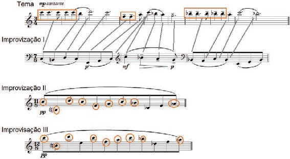 A improvização I é construída a partir de uma ideia diretamente derivada das notas do tema. As duas seguintes são construídas a partir de ostinatos que, igualmente, derivam do tema. Nestas duas últimas observamos a fragmentação (que é inclusive o procedimento mais característico deste movimento) do “tema das Rosas”, seja pela ampliação do seu in- tervalo inicial característico, seja pelo espaçamento métrico dado aos eventos, muito simi- lar ao que ocorreu no Trio do Scherzo (2º movimento). O exemplo seguinte (Exemplo 14) de- monstra as transformações que o compositor utiliza neste movimento para construção de cada improvisação.