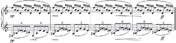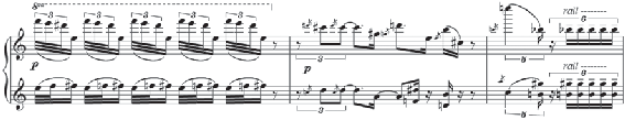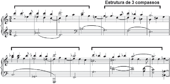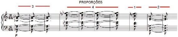 A ordem de apresentação dos tricordes 3-11 ampliando e reduzindo os tempos de cada compasso estabelece uma fluidez rítmica e uma sucessão harmônica que impede a es- tabilização de qualquer centro tonal, fato ressaltado pela utilização do pedal.