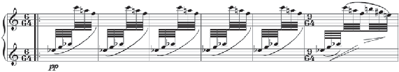 Exemplo n.15: Sonata n. 10 para piano de Almeida Prado, diluição do ostinato, 3º mov., c.62-65.