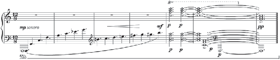 Exemplo n.16: Sonata n. 10 para piano de Almeida Prado, série harmônica e acordes finais, 3º mov., c.68-73.