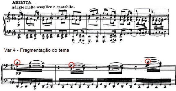 109 de Beethoven e a utilização de “variações livres” para a construção do movimento final, com a utilização de progressiva fragmentação do tema sobre ostinatos. Na primeira, ambos os compositores estabelecem uma forma quase Sonata no primeiro movimento, sequencias agitadas que emolduram uma bela melodia, utilizam um rápido andamento no segundo, com caráter de Scherzo e finalmente concluem com variações. Na segunda característica podemos comparar a pulsação ternária e a fragmentação do tema popular a que Beethoven conduz na Sonata n. 32 op. 111 (Exemplo 17), também sobre um pedal em tremolo (ostina- to) na 4ª variação.
