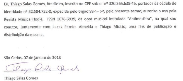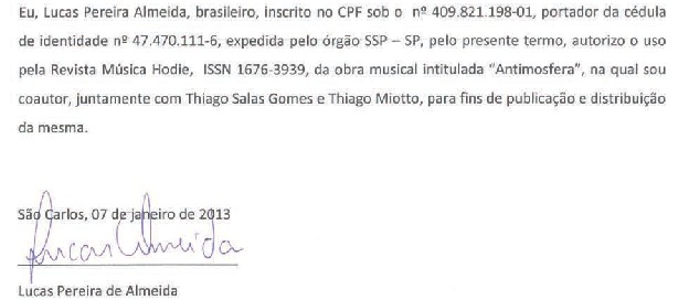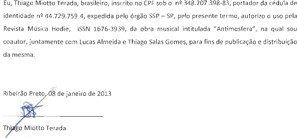 Submeto esta obra musical para apreciação do Conselho Editorial da Música Hodie. No caso de aprovação da mesma, autorizo Musica Hodie a publicá-lo de forma impressa, em CDRom ou on-line no site e no portal do periódico.