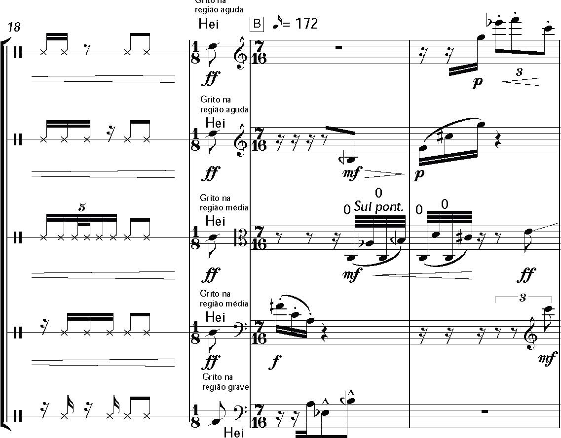= Grito na região indicada: 1ª linha: grave; 2ªlinha: médio e 3ª linha: agudo
