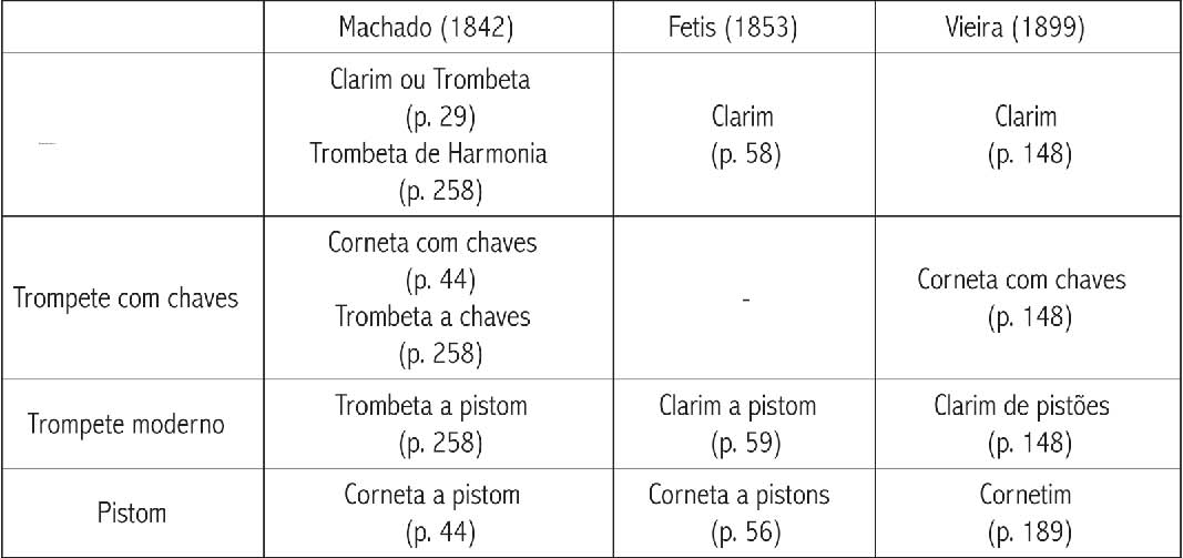 Considere-se ainda que além dos instrumentos circulavam partituras de música impressa e obras teóricas (dicionários e manuais), e que estes se apresentavam tanto em língua estrangeira, especialmente o francês, como em traduções para o português. Surge destas circunstâncias a grande variedade de termos para indicar os instrumentos de sopro que hoje podemos ver grafados nos manuscritos de música. A tabela 1 contém a nomenclatura para trompetes e pistons em três dicionários do século XIX.