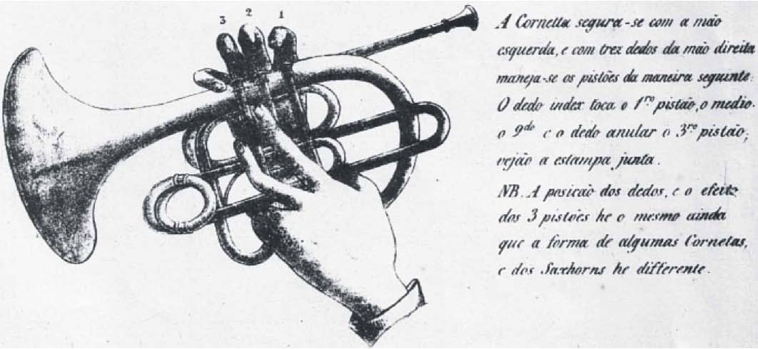 O que estamos denominando pistom é conhecido em francês como cornet à pistons; em inglês cornet e em espanhol cornetín. No Brasil, nas primeiras décadas do século XX, ele foi gradualmente caindo em desuso, sendo substituído pelo trompete moderno, processo que ainda não foi estudado. Já na segunda metade do século XIX, pistons e trompetes coexistiram, como aparece por exemplo nas partes instrumentais do hino Maria, Mater gratiæ composto em 1864 pelo músico mineiro Emílio Soares de Gouveia Horta Júnior: “Clarim em fá” e “Cornette 1.º em si bemol” e “Corneta 2.º em si bemol”.7 Tanto este caso como no “Méthodo para Cornetta, Clarim, Ou Saxhorn, de João Bartolomeu Klier” (Figura 2) o termo corneta pode ser explicado pela influência do termo no italiano cornetta.