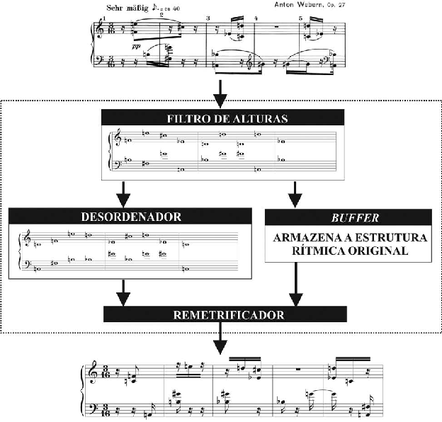 O diagrama da Figura 1 exemplifica um sistema original aberto, cuja estrutura é formada pela coordenação de quatro ferramentas ou subsistemas internos: um filtro de al- turas, que tem a função de abstrair as alturas, armazenando a estrutura rítmica em um bu- ffer, para posterior utilização (sendo o próprio buffer um subsistema); um desordenador4, cuja função é embaralhar as alturas de determinado segmento; e, finalmente, um remetri- ficador, que reaplica a estrutura rítmica original armazenada no buffer às alturas produ- zidas pelo desordenador. Assim, ao alimentarmos esse sistema com os cinco compassos iniciais das Variações para Piano, Op. 27, de Anton Webern, o sistema inicialmente remo- ve a estrutura rítmica armazenando-a em um buffer, desordena as alturas (individualmen- te para as pautas inferior e posterior), reaplica a estrutura rítmica original e fornece uma nova saída, com a mesma estrutura rítmica da peça original, mas com as alturas totalmen- te desordenadas. Observe-se que esse sistema é insensível ao andamento, às dinâmicas e às articulações do texto original, e, assim, estes parâmetros são eliminados durante o pro- cesso transformacional. Um estudo aprofundado sobre sistemas intertextuais, incluindo diversas aplicações composicionais a partir da manipulação de intertextos, pode ser en- contrado em Lima (2011).