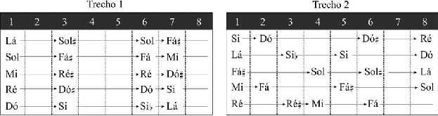 As Figuras 3 e 4 mostram respectivamente os Trechos 1 e 2, compostos a partir das características planejadas. Observe-se que, enquanto ambos os trechos seguem rigoro- samente as definições impostas pelo sistema, as flexibilidades possibilitadas pela genera- lização, que são características ontológicas do sistema, e as diferenciações decorrentes das decisões composicionais adotadas na fase de planejamento, conferem a estes trechos perfis bastante distintos.