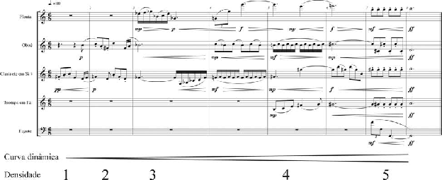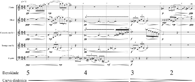Desta forma, o Trecho 1, conforme determina a Definição 1, se restringe exclusi- vamente às alturas determinadas na fase de planejamento (Figura 2) e as conexões entre as sonoridades seguem a Definição 2, que estabelece a parcimônia de condução como o prin- cípio predominante, mas não exclusivo. Das onze passagens de conexão entre as sonorida- des (inícios dos compassos 3, 6 e 7) uma passagem apenas não utiliza a parcimônia (oboé entre o compassos 6 e 7) e outra passagem, embora utilizando um intervalo de segunda menor, vai em direção contrária ao estabelecido no planejamento (clarinete entre os com- passos 5 e 6). A textura, conforme foi estabelecido no planejamento, vai de densa para ra- refeita, segundo se verifica pela quantidade decrescente de instrumentos atuantes (5-4-3-