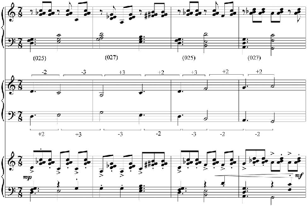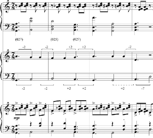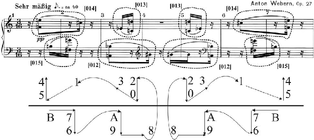 Figura 6: Análise dos sete compassos iniciais das Variações para Piano, Op. 27, de Webern.