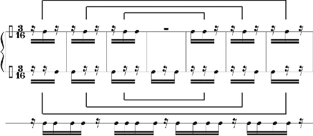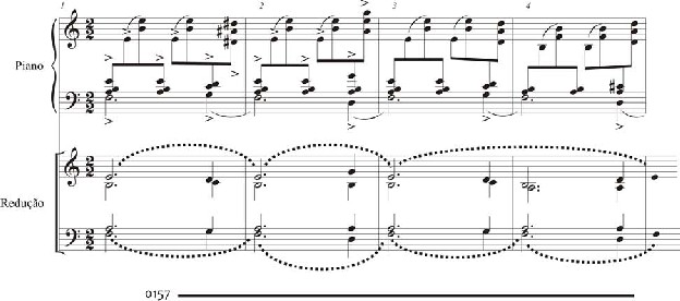 do trecho é formada pela justaposição de quatro classes de conjuntos que têm a possibilida- de de se conectar parcimoniosamente pela alteração de apenas uma classe de altura: [012], [013], [014], [015]. A estrutura rítmica também é palindrômica, como se pode verificar ao considerarmos apenas os pontos de ataque10 do trecho, isto é, eliminando o aspecto duracio- nal dos eventos rítmicos (Figura 7). Observa-se que a máxima simultaneidade de pontos de ataque que ocorre no trecho se dá no somente em nível de díades e que a resultante rítmica da justaposição dos conteúdos de ambas as mãos do piano, gera um padrão de grupos de se- micolcheias separados por pausas de semicolcheias (linha inferior da Figura 7) que não se sintoniza com a métrica ternária indicada na superfície.