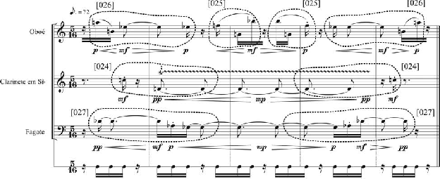 de apresentação da série etc. Permanecem como características fundamentais as ideias de palíndromo (para as alturas e para o ritmo), de construção da série por tricordes com alto grau de relação parcimoniosa, de uso de segmentos tricordais, de assincronismo entre fór- mula de compasso e figurações rítmicas e de máxima simultaneidade de ponto de ataque em nível de díade.