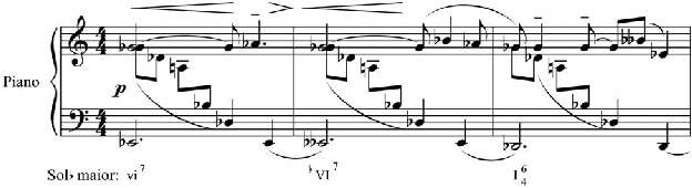 Outro fato observável nesses quatro primeiros compassos da obra diz respeito ao material escalar utilizado. Mesmo sem a exclusão das notas ornamentais, constata-se uma predominância da escala diatônica de Dó maior com centricidade em Fá, o que poderia ca- racterizar o emprego do modo Lídio, ou simplesmente um uso pandiatônico do material es- calar. As alturas empregadas na linha melódica também têm relação com a pentatônica de Sol incompleta (sem o Lá).![]()