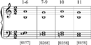 Entre as alturas dos acordes pilares da seção A, como um todo, predomina a cone- xão parcimoniosa. Destes acordes, o primeiro é um [0157], o segundo é um tetracorde [0268] (comumente encontrado no período tonal com a denominação de sexta francesa), e os dois últimos são tríades com sétima, configurando um Ré menor com sétima menor, [0358], e um Dó maior com sétima maior, [0158]. A Figura 17 mostra estes acordes pilares e os compas- sos da seção A onde ocorrem.