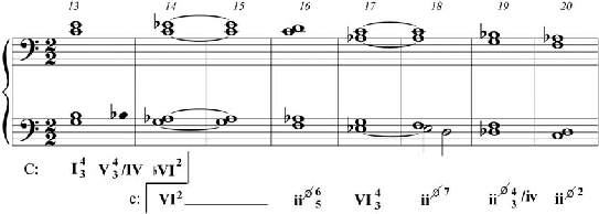 A harmonia da seção B se articula claramente em torno de Dó menor, ou seja, o ma- terial harmônico é preponderantemente triádico, com justaposições de sétimas, apresentan- do ênfase no ii grau meio-diminuto e no VI grau. No entanto, a focalização constante nessas duas funções compromete a sintaxe e cria ambiguidade com relação à identidade tonal da seção. Um acorde emprestado da tonalidade do iv grau tem a função de conectar cromatica- mente a linha do baixo no compasso 19. A Figura 18 mostra a redução da seção B.![]()