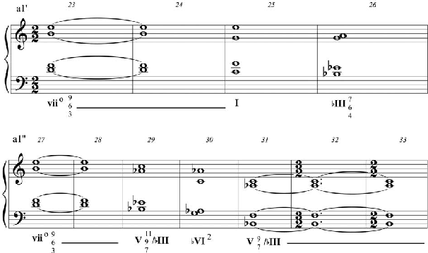 A harmonia da seção A’ opera de maneira similar ao que ocorre no desenvolvimen- to de uma forma sonata, onde as essências contrastantes dos temas se alternam e se fun- dem. Nessa seção, o primeiro período (a1’) configura Dó maior e o segundo período (a1’’) Mib maior, que pelo parentesco com Dó menor, pode ser associado à seção B. Os acordes pi- lares dessa seção são mostrados na Figura 19.