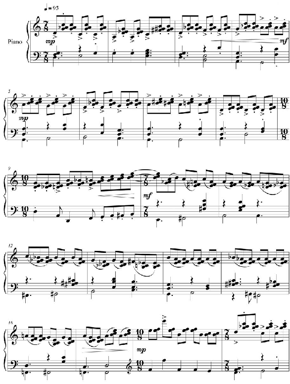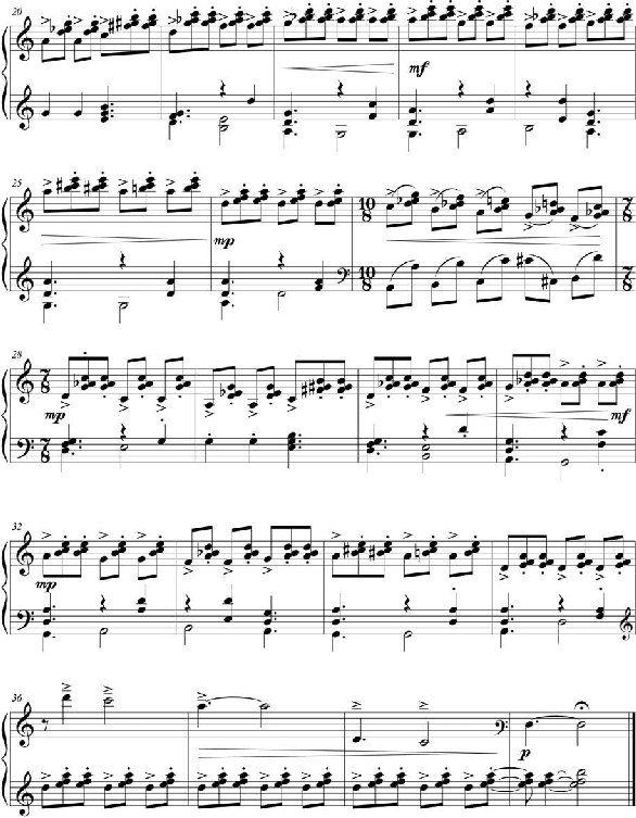 A textura será formada por três camadas. As camadas superior e intermediária, intimamente conectadas e indivisíveis, consistirão de um ostinato de colcheias, dentro de uma métrica 7/8 para os períodos e 10/8 para os conectores. O material desse ostinato será formado por dois intervalos consecutivos: uma terça (maior ou menor) e uma segunda (maior ou menor). Estes intervalos aparecerão de maneira simultâneos, sendo a terça, prio- ritariamente, o intervalo superior. Um componente importante desse ostinato é uma linha melódica, estruturalmente pertencente à camada intermediária, que se sobressairá e será indicada por acentos. Esta linha melódica utilizará as notas de uma escala pentatônica que se adequará à harmonia planejada. Um exemplo genérico da construção dessas duas cama- das é mostrado na Figura 22, na qual as características acima indicadas podem ser observa- das. Uma característica importante, que foi utilizada por Guarnieri somente no período a1, mas que integrará grande parte da linha melódica do Ponteio Nº 5, de Pedro Miguel, é que, esta melodia será construída de forma especular com relação à linha do baixo, a qual tam- bém utilizará material de uma escala pentatônica livremente determinada.