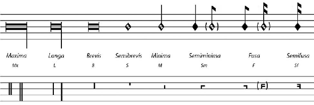 Diferentemente da musica plana medieval, em que o texto e a melodia seguramente predominaram sobre qualquer outro aspecto musical, a polifonia vocal da Renascença exi- be uma notável complexidade rítmica. A representação gráfica da musica mensurata exigiu, ainda na Idade Média, uma definição mais precisa das relações entre a duração dos sons do que aquela expressa pelos neumas no canto gregoriano, e os valores das figuras musicais passaram a obedecer a um rigoroso sistema de proporções, parte do qual subsiste até nossos dias. Na Figura 1, estão representadas as figuras e pausas da maneira como eram utilizadas por volta de 1450: