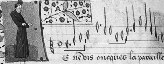 Exemplo 6: Início da voz superior da canção Je ne vis oncques la pareille, de Dufay ou Binchois. Perfeições indicadas por colchetes (CHANSONNIER LABORDE, ca. 1450, fol. 43v).