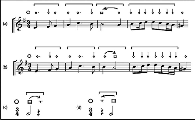 , não explicitando a relação de valores que deve ser mantida com os compassos precedentes. Nas opções (d) e (e), portanto, a mudança é interpretada de acordo com a segunda função citada por DeFord – isto é, considera-se, nestes casos, que a indica- ção