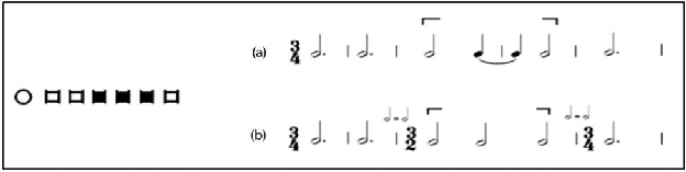 Embora este trecho esteja, do ponto de vista dos valores, corretamente transcrito nos dois casos, a forma (b) pode ser preferível por não sugerir o efeito de síncopa observa- do em (a) e destacar a existência da nova estrutura rítmica formada pelas notas coloridas. Este tipo de mudança nas fórmulas de compasso ao longo de uma peça é bastante comum nas transcrições da música renascentista e representa uma tentativa de evitar a sugestão de![]()