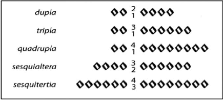 Na notação branca, as possibilidades de expressão gráfica das relações existentes entre as figuras musicais podem ainda ser consideravelmente ampliadas através do uso do conceito matemático de proporção. Quando aplicada à música mensural, uma proporção diz respeito a duas diferentes quantidades de figuras que devem ser executadas em iguais in- tervalos de tempo. Os casos matematicamente mais complexos não eram frequentes no re- pertório do século XVI, sendo os mais usuais a dupla (2:1), a tripla (3:1), a quadrupla (4:1), a sesquialtera (3:2) e a sesquitertia (4:3). As indicações numéricas que denotavam estas cinco razões estão apresentadas na Figura 9, onde os grupos de semibreves à direita devem ter a mesma duração daqueles à esquerda: