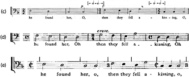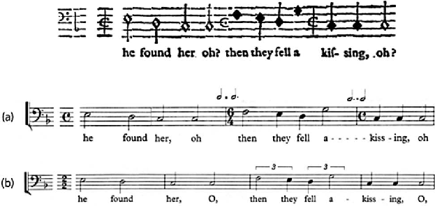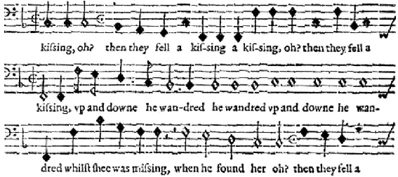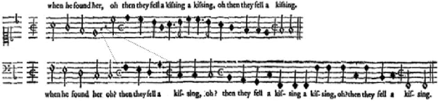 Se as divergências entre estas transcrições deixam dúvidas a respeito da relação originalmente pretendida pelo compositor, uma comparação entre o bassus e o cantus ori- ginais de Farmer parece fornecer, neste caso, uma solução para o problema: na primei- ra frase da seção Oh then they fell a-kissing, a voz superior tem pausas e não apresenta uma das mudanças de
