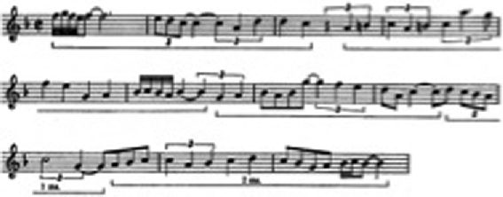 1987, p. 108). Uma ilustração extraída do texto de Schoenberg (SCHOENBERG, 1975, p. 426), mostra o tema de “Der Abschiede”, último movimento de Das Lied von der Erde, de Mahler. Schoenberg comenta: “todas as unidades variam grandemente em forma, tamanho e conteú- do, como se elas não fossem partes motívicas de uma unidade melódica, mas palavras, cada qual com seu propósito dentro de uma sentença” (p. 426) (Vide Exemplo 1).12