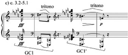 -longas-curtas. O primeiro gesto cadencial [GC1] tem como suas alturas finais o intervalo de trítono descendente. O gesto cadencial [GC1’] seguinte respeita as mesmas proporções de notas curtas-longas-curtas, no entanto, é modificado pela aumentação rítmica. O interva- lo de trítono descendente é transposto uma terça menor descendente. O efeito geral do seg- mento cadencial é de um rallentando escrito. Os dois gestos cadenciais são suficientemen- te semelhantes para denotar a sua relação motívica. No entanto e para cumprir a função de gesto cadencial que encerra a seção inicial da peça, um maior grau de semelhança entre os dois gestos é necessário. Novamente a ideia de prosa musical, de uma exposição de diferen- tes ideias musicais contrastantes, assimétricas e subsequentes, está presente.