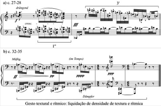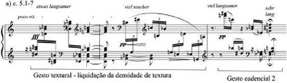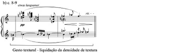 A seção de transição é baseada na redução da densidade da textura nos c. 5.1-7 (Exemplo 4). Tal gesto textural inicia-se no c. 5.1 com tricordes densos em semicolcheias com dinâmica fff o que é seguido no c. 6 por tercinas de semicolcheias que caracterizam uma diminuição abrupta da densidade da textura pois não apresentam a textura cordal do compasso anterior. No c. 7 um pequeno gesto cadencial (GC2) interrompe a continuidade da música com uma fermata marcada sehr lang (Exemplo 4a). Nos c. 8-9 a intenção do gesto textural anterior (c. 5.1-7) é repetida, ou seja, há uma nova redução da densidade da textu- ra que conduz a um gesto de encerramento (c. 9) (Exemplo 4b). Ambas as passagens apre- sentam a mesma intenção gestual abrindo a possibilidade de entendimento de gesto musi- cal como um “artifício” que produz música diferente mas com a mesma função formal. Por exemplo, as duas passagens ilustradas apresentam a função de gesto textural, no entanto são musicalmente distintas.
