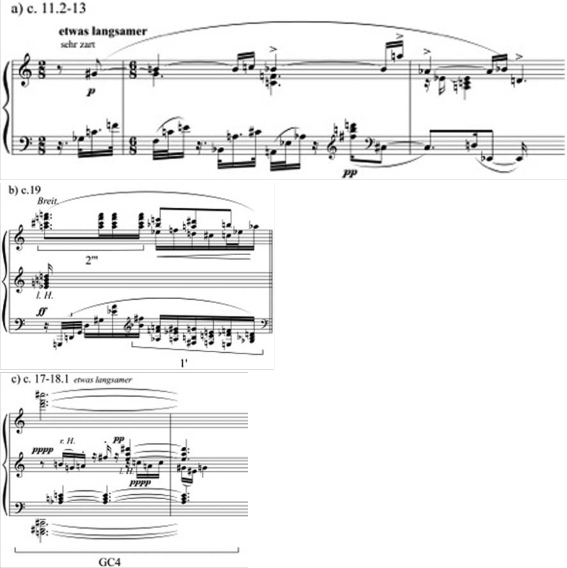 Exemplo 5a, 5b e 5c: Schoenberg, Op. 11, No. 3; c. 11.2-13; c. 19; c. 17-18.1.