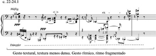 A segunda transição (c. 22-24.1), ilustrada no Exemplo 6, é definida principalmente pela mudança abrupta na densidade da textura (gesto textural) e pela fragmentação rítmica (gesto rítmico). A indicação Mäßig [andamento moderado], também sugere uma mudança de atmosfera e que permite criar um contraste acentuado da seção subsequente para com esta seção de transição.