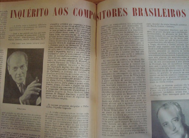 1958; janeiro de 1959; fevereiro de 1959; março de 1959. Trata-se de um inquérito realizado por Lopes-Graça, quando de sua turné ao Brasil em 1958. Foram entrevistados: Villa- Lobos, Camargo Guarnieri, Francisco Mignone, Cláudio Santoro, Guerra-Peixe e Luiz Cosme.![]()