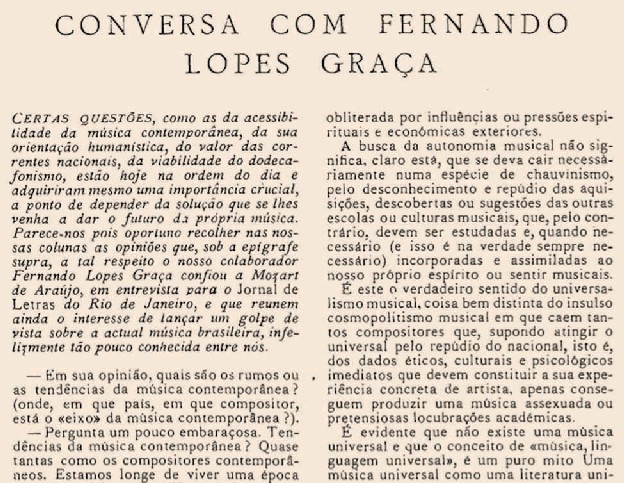 Devido à impossibilidade de atermo-nos sobre a totalidade deste corpus documen- tal no âmbito de um artigo, ou mesmo de lançarmos uma discussão satisfatória quanto à re- levância de cada um destes documentos para o complexo debate que vinha sendo projetado no Brasil e em Portugal - por mediação de Lopes-Graça -, optamos em priorizar aquele que inaugurou simbolicamente o intercâmbio entre o músico português e a cultura brasileira e que, em nossa opinião, cativou definitivamente a simpatia e confiança dos nossos músicos, especialmente dos ex-dodecafonistas. Trata-se da Conversa com Fernando Lopes Graça, en- trevista publicada originalmente no Jornal de Letras do Rio de Janeiro, em 1951, e reimpres-