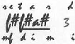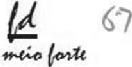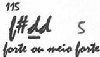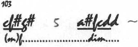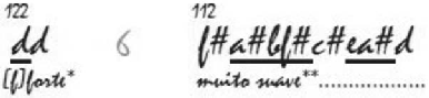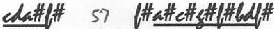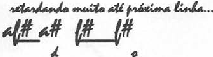 1.2) As notas executadas, bem como as indicações de andamentos e demais elementos fraseológicos, também são designados por meio de letras e representadas com outra fonte, que também remete à caligrafia. As sequencias de notas C-F#-G# e A#-F-C- D-D são representadas da seguinte forma na partitura: