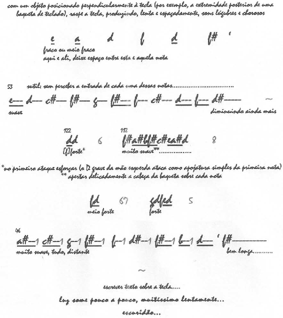 1.4) O intérprete, no final da peça, deve escrever sobre a tecla do instrumento, o que reitera a importância do ato de escrever textos. O fato de que dificilmente alguém pode escutar, e muito menos saber o que está sendo escrito, evidencia a distância entre aquele que toca e aquele que ouve. Este hiato entre alguém que vive determi- nada experiência e aqueles que o vêem, assistem ou ouvem, foi sempre uma preocu- pação no trabalho do compositor, fundamentando sua visão da não necessidade de se tocar ou interpretar. Isto é acentuado pelo fato de que outro hiato existe dentro do próprio executante e criador – a enorme distância entre aquilo que se executa e aquilo que se pensa ou sente. E na outra extremidade do processo de execução e re- cepção de uma obra o público estabelece vários outros sentidos para ela, de acordo com a experiência de cada um que a percebe. Seria possível ser de outra maneira? E se não for, por que tanta preocupação com traduções, representações e hiatos?
