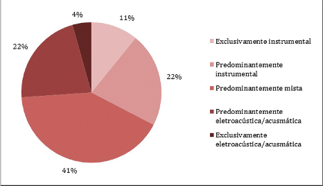Uma das hipóteses mais comuns em termos de delimitação de grupos ao trabalhar diacronicamente é a do fator geracional.9 Partindo desse pressuposto, certas caraterísticas tenderiam a incidir predominantemente sobre faixas etárias específicas dentro do grupo maior. Conforme dissemos anteriormente, o critério de escolha dos compositores que res- ponderiam a nosso questionário era o de produzir ou já haver produzido música eletroacús- tica em algum momento de sua carreira. Além disso, buscamos levantar especificamente qual o tipo de produção a que o compositor vem se dedicando nos últimos cinco anos, che- gando à proporção abaixo:![]()