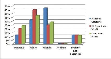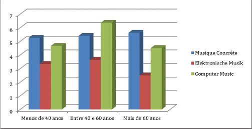 Após uma primeira leitura das respostas ao questionário, pareceu-nos possível de- tectar uma diminuição da influência da Elektronische Musik junto às gerações mais jovens, ao mesmo tempo em que a Computer Music cresceria em importância, permanecendo a Musique Concrète mais ou menos estável em termos de influência. Malgrado nossa inclina- ção a, seguindo a hipótese geracional clássica, enxergar essa variação de influência entre as correntes segundo as faixas etárias dos respondentes, como dissemos, a tabulação e avalia- ção cuidadosa das respostas obtidas se mostrou refratária ao estabelecimento de qualquer padrão geracional mais específico.