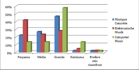 Já em relação à Musique Concrète, talvez seja possível sentir um reflexo tardio da influência francesa que marcou por muito tempo a tradição intelectual brasileira. Algo que se confirmaria, então, se interpretássemos o Gráfico 5 a partir do Gráfico 6, onde ve- mos que, apesar de muito lida – contando com quase vinte pontos porcentuais de vanta- gem em relação à Computer Music entre aqueles que afirmaram ter um conhecimento pro- fundo de seu legado –, ela fica cerca de quinze pontos percentuais abaixo desta em termos de influência.