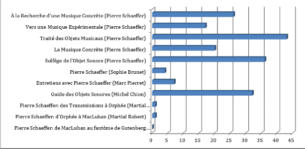 Assim, essa homogeneidade é já significativa. Como dissemos, dentre os composi- tores brasileiros que produzem ou produziram música eletroacústica que pudemos mapear, cerca de 70% responderam ao questionário, o que oferece um número expressivo em termos relativos. Desse modo, apesar de todas as diferenças de origem, faixa etária e mesmo de for- mação, aquilo que esses compositores leram e o que os marcou, especialmente no que tange ao que estamos entendendo aqui por “matrizes da música eletroacústica” teve um alcance bastante similar.