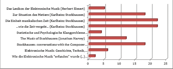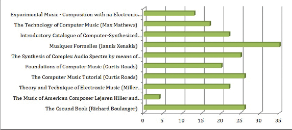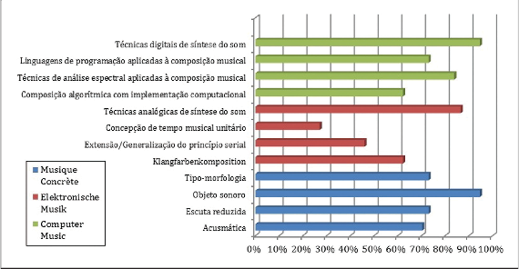 Outras considerações interessantes a fazer estão ligadas à relação geral entre o co- nhecimento do legado teórico das três matrizes e a influência exercida por elas sobre a pro- dução desses compositores. Como se pode perceber nos dois gráficos abaixo, a Elektronische Musik ocupa uma posição curiosa, especialmente se lembrarmos que, simultaneamente, a Computer Music teve um alcance muito grande em termos de leituras das obras ligadas a ela