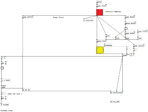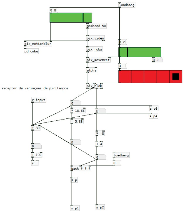 O primeiro patch (Figura 1) foi desenvolvido com o intuito de gerar e manipular ob- jetos gráficos (formas geométricas ou estruturas lineares), associados aos aspectos sonoros recebidos, que se modificam dinamicamente em termos de formas e cores, criando uma as- sociação com os dados de áudio recebido e os dados gestuais. Ou seja, quando o som recebi- do através do software voip e as imagens captadas pela webcam são introduzidos no patch número 1, as variações deste conteúdo podem alterar os comandos algorítmicos dos objetos gráficos, os tornando conteúdos mutáveis, dependentes das variações sonoras.