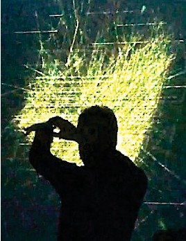 Figura 3: Imagem de um momento da performance do projeto DP, detalhando um gesto do interprete, que controla a geração sonora e também gráfica, observada na estrutura verde-amarelo ao fundo. Esta é gerada dinamicamente pelo modelo computacional contido no primeiro patch.