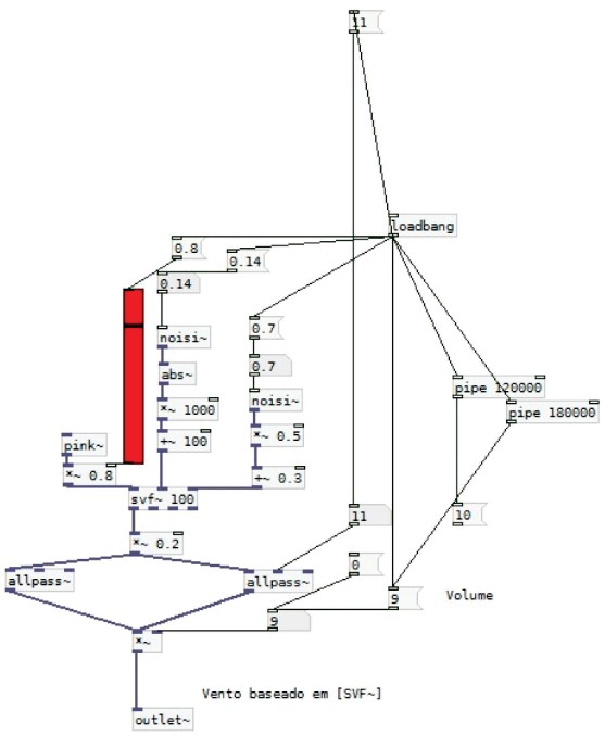 O segundo patch é um modelo computacional de síntese sonora subtrativa dinâmi- ca que emula sons contínuos e ruidosos, como o característico som de vento ou de ondas do mar. Para isto foi utilizado um objeto do Pd que cumpre a função de um gerador de ru- ído branco (ver na Figura 3, o objeto “noise~”). O áudio produzido por este objeto foi, em seguida, processado por outro objeto que implementa o algoritmo Chamberlin de filtro de estado-variável. Este implementa 3 filtros simultâneos: passa-baixa, passa-alta, passa-faixa, e rejeita-faixa (ver o objeto “svf~”). No caso deste patch, utilizou-se apenas a saída corres- pondente ao filtro passa-baixa (low-pass). Este modelo de síntese visa proporcionar uma so- norização para o streaming de áudio digital, dinamicamente controlado, coletado de múlti- plas paisagens sonoras.
