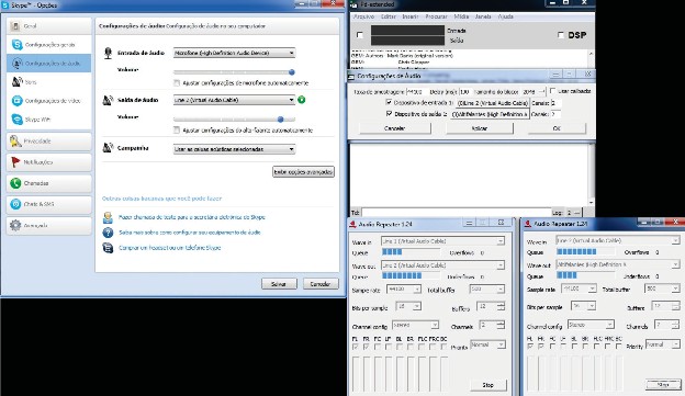 Durante a implementação deste projeto, constatou-se que a comunicação de áudio entre Pd e VoIP não era uma tarefa trivial, como se imaginava a princípio, ao se utilizar o Pd em Linux. Ao pesquisar aplicações de softwares gratuitos e de código-livre que realizas- sem tal tarefa encontrou-se uma aplicação open-source simples, desenvolvida apenas para Windows, que foi capaz de realizar com sucesso a tarefa de comunicação de áudio entre estes softwares. Este aplicativo é denominado Virtual Audio Cable (VAC)2. Trata-se de um aplicativo gratuito capaz de transferir canais de áudio de um software para outro dentro do mesmo ambiente computacional. Podem existir outras aplicações disponíveis com função similar. No entanto, de todas aquelas testadas para Linux e Windows, apenas o VAC foi ca- paz de reconhecer e ser reconhecido pelo VoIP utilizado; o Skype. A fim de permitir a trans- ferência de áudio do Skype para Pd através do VAC, deve-se criar dois “cabos virtuais” nes- te software, que apresenta diversas entradas e saídas para vários canais de áudio. Uma vez que estes cabos virtuais são criados, o Skype e o Pd são instantaneamente reconhecidos e conectados. Para a interação dos envolvidos foi utilizado uma rede de internet de alta velo- cidade (banda larga). Esta integração será aqui apresentada em forma de GUIs possuindo o objetivo de apresentar os mecanismos capazes de propiciar a interação do software Skype com a plataforma Pd. A figura a seguir demonstra um snapshot da integração destes três softwares (Pd, Skype e VAC) em execução e comunicando áudio entre si, em tempo-real.